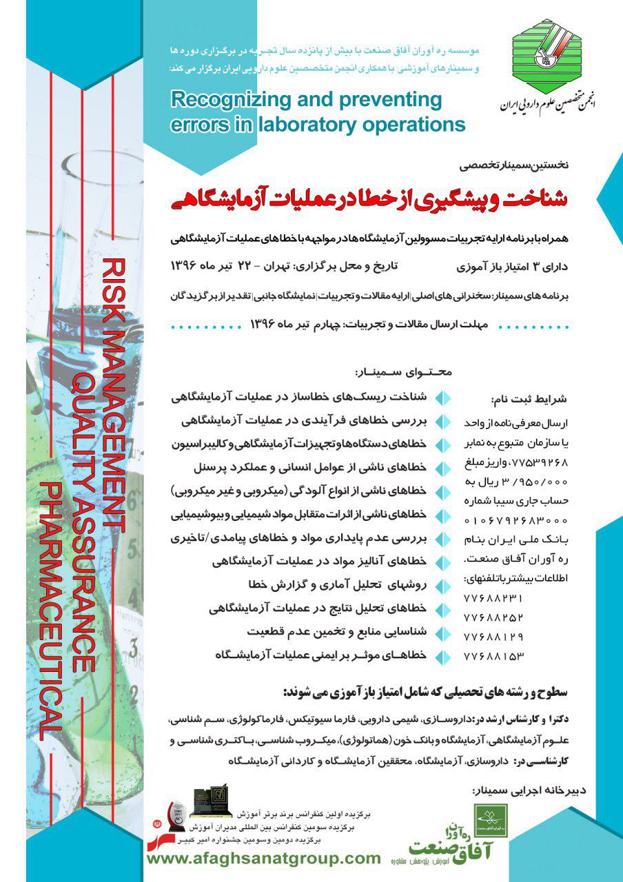 موسسه ره آوران آفاق صنعت با همکاری انجمن متخصصین علوم دارویی ایران نخستین سمینار تخصصی شناخت و پیشگیری از خطا در عملیات آزمایشگاهی را مورخ 22 تیرماه 1396 در تهران برگزار مینماید. لازم به ذکر است انجمن مواد جهش زای زیست محیطی ایران و کمیته فناوری نانو سازمان غذا و دارو از حامیان این سمینار هستند.